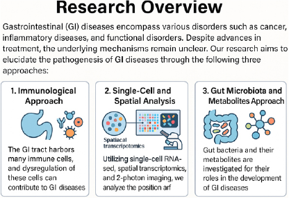 Gastrointestinal (GI) diseases encompass a wide range of conditions affecting both hollow organs (esophagus, stomach, small intestine, colon) and solid organs (liver, pancreas). These include cancer, inflammatory diseases, and functional disorders. Although numerous therapeutic strategies have been developed, disease definitions are still largely based on macroscopic findings such as symptoms and endoscopic morphology. This has limited our ability to stratify patients biologically and has led to variable treatment responses among individuals. To elucidate the underlying mechanisms of these diseases at molecular and cellular levels, our lab propose a multifaceted approach incorporating the following three methodologies: